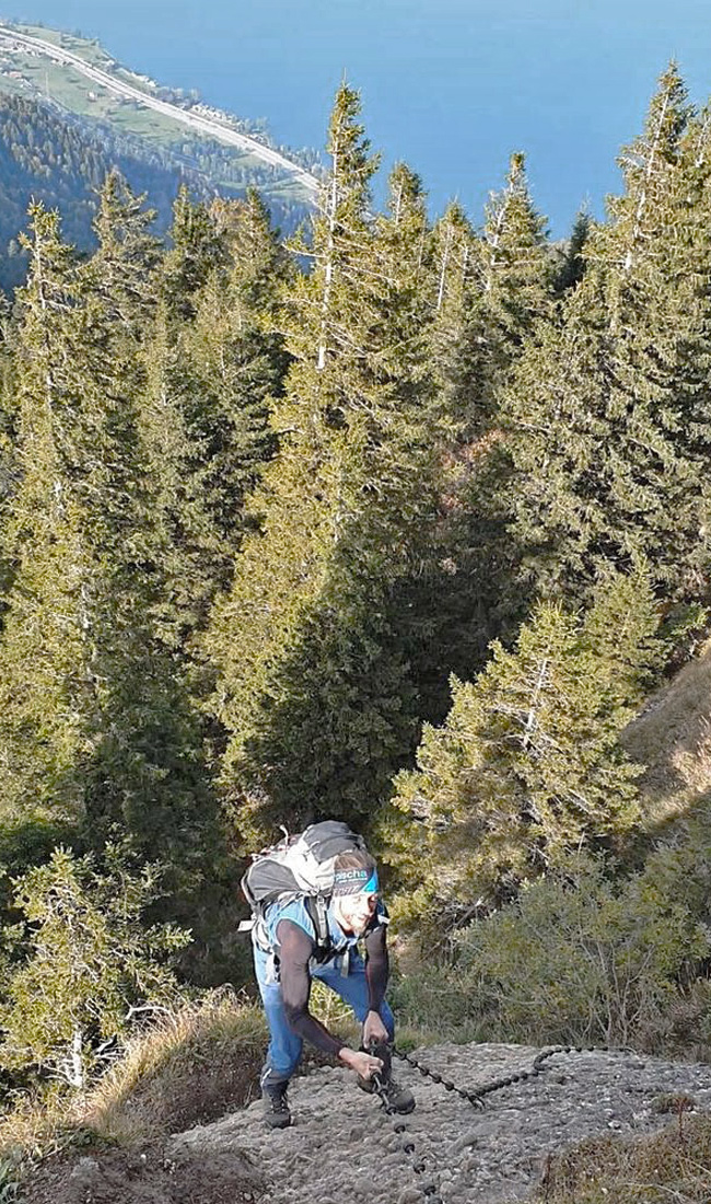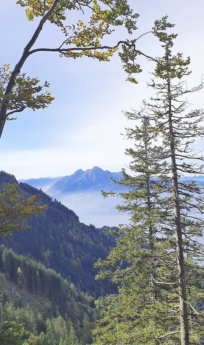 From Seebodenalp we hike leisurely narrow paths upwards, through forests, until we arrive above the cloud cover. After a refreshment in the sun at the top, we decide to descend along the so-called 'butt cheek path' - what a name! Okay, after the first few metres we know why: in very steep terrain there are only small trails, some of them secured by wire ropes at lofty heights. You can pinch your butt at one point or another ? Surely this path is not suitable for everyone, and okay, it would be better to walk up it instead of choosing it for the descent. You're always smarter afterwards.
