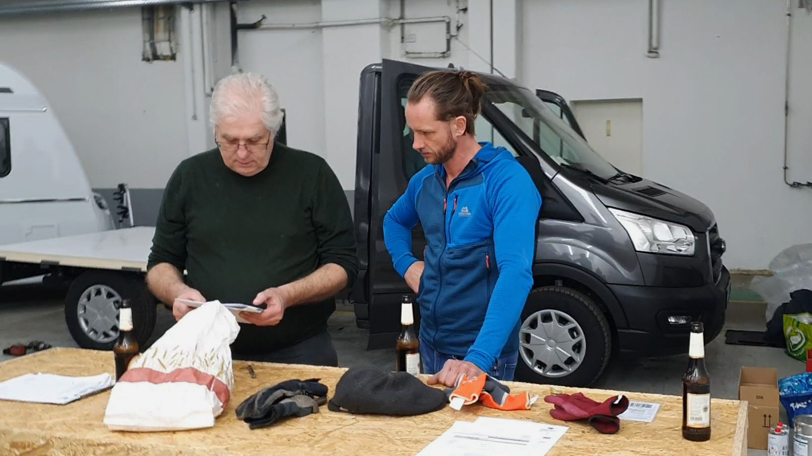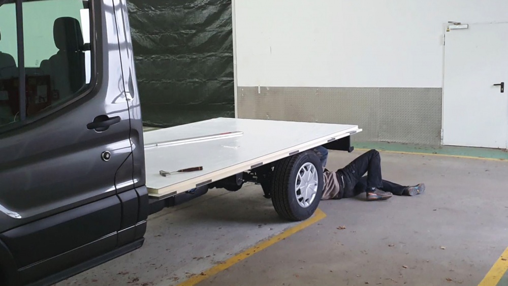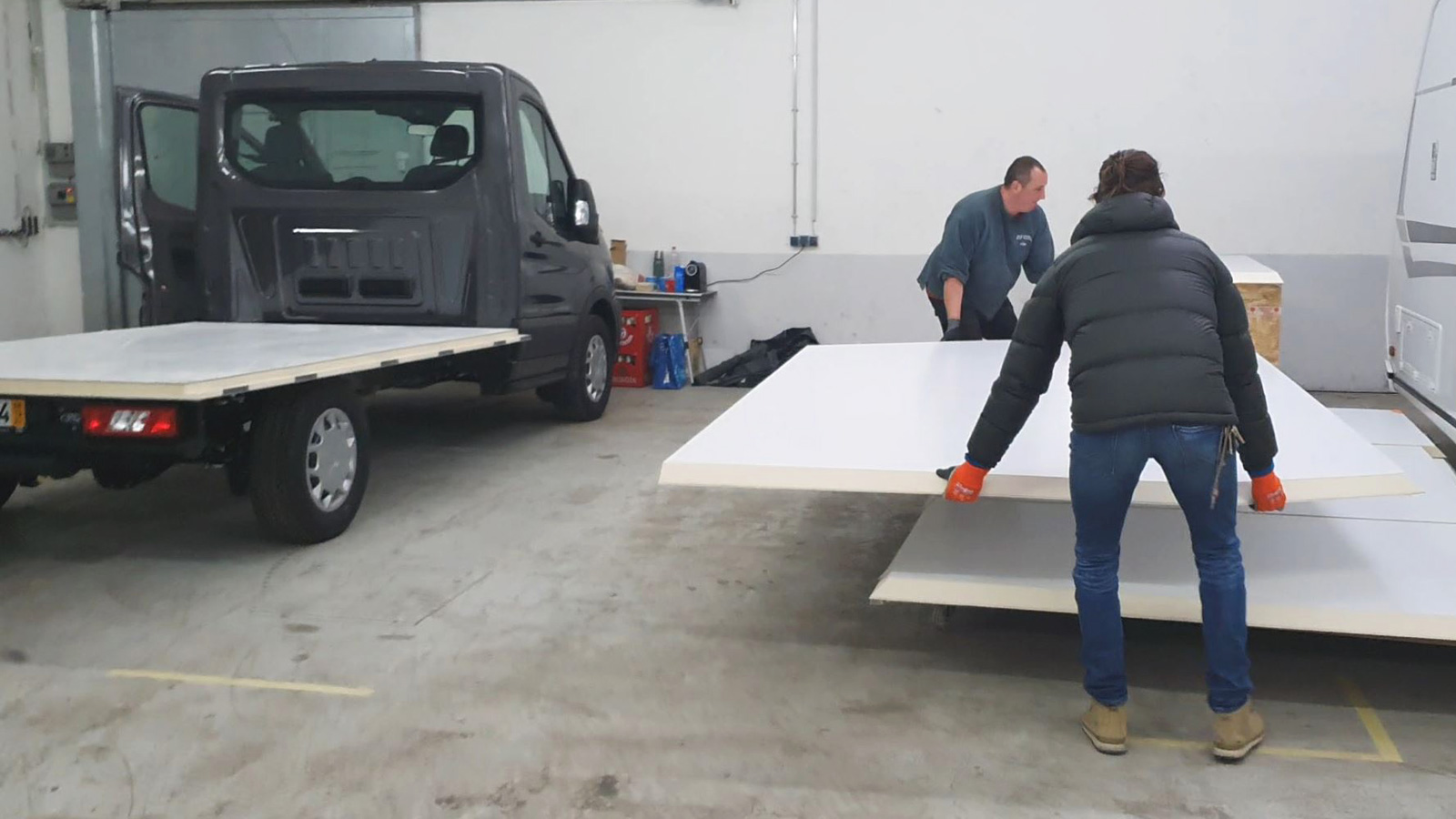 The big side panels and the heavy floor panel have to be unloaded first, plus all the angle strips, and a huge box with the real glass windows, the door and flaps from Outbounds. The cabin was made for us by Nomad Campers, a company that is specalized in building custom cabins for campers.